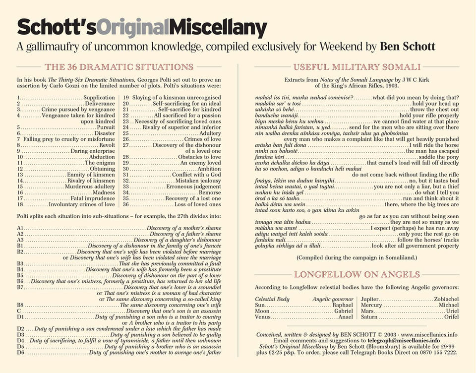 Miscellany column for the ‘Weekend’ section of the Saturday Daily Telegraph.